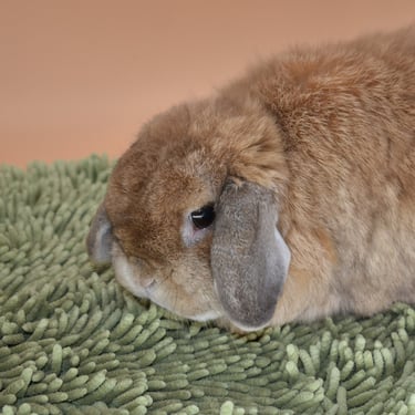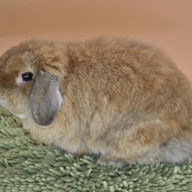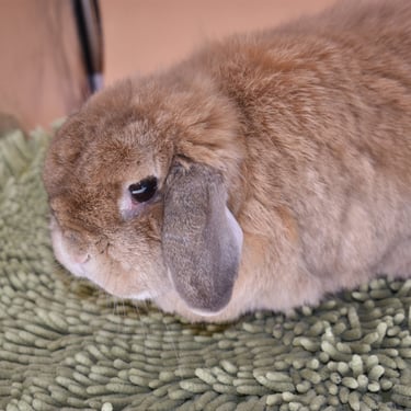 Goldilocks is a warm, sunshine-colored solid orange doe with a heart full of sweetness and a deep, abiding love for comfort. Now a seasoned lady of eight years, she has perfected the fine art of flopping and generously uses her wisdom to guide the younger, over-energetic employees toward a healthier work–rest balance.
